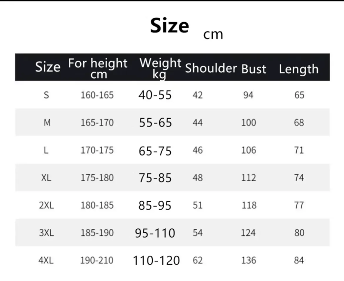 S, M, L, XL, XXL, 3XL, 4XL