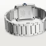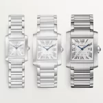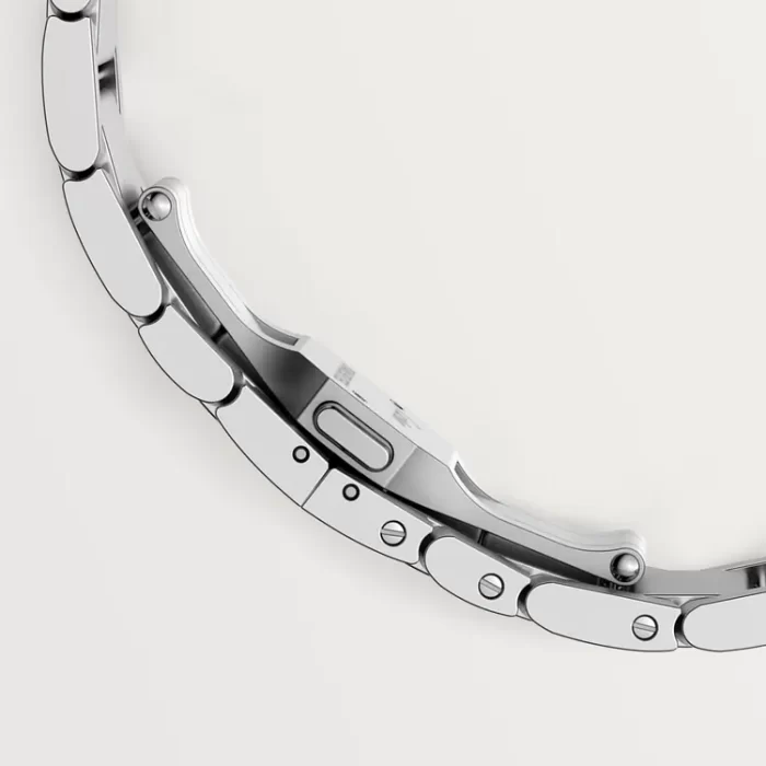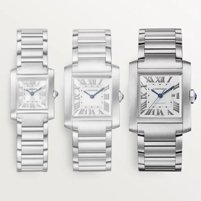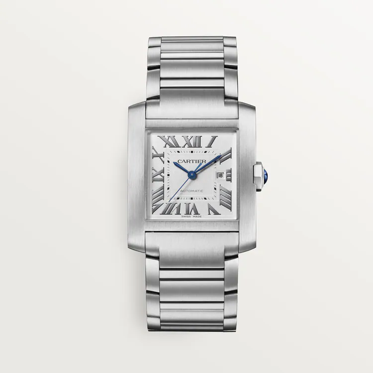 Tank Française watch, large model, mechanical movement with automatic winding. Steel case. Faceted crown in steel decorated with a synthetic cabochon-shaped spinel. Silvered dial, blued-steel sword-shaped hands, sapphire crystal. Steel bracelet. Case dimensions: 36.7 mm x 30.5 mm, thickness: 10.1 mm. Water-resistant up to 3 bar (approx. 30 meters/100 feet).