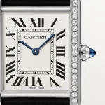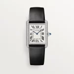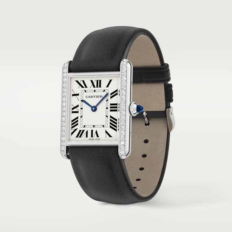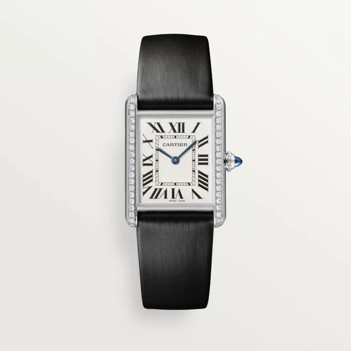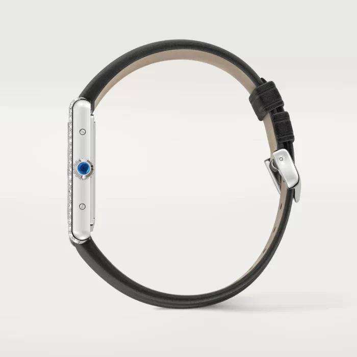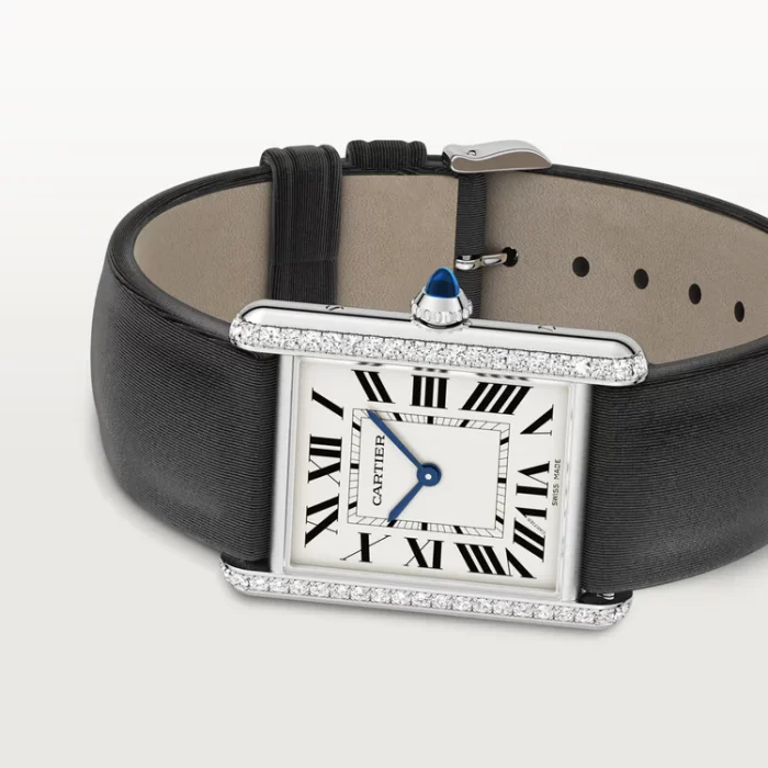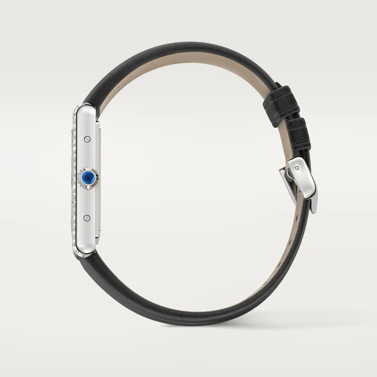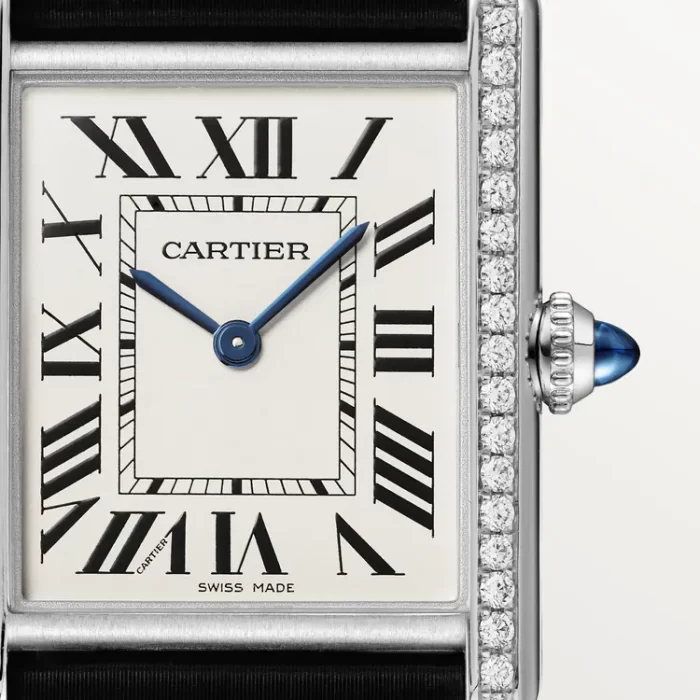 Tank Must watch, large model, high autonomy quartz movement. Steel case, bezel set with 42 brilliant-cut diamonds totaling 0.48 carats, beaded crown set with a synthetic cabochon-shaped spinel, silvered dial, blued-steel sword-shaped hands, interchangeable black brushed calfskin strap, steel ardillon buckle. Case dimensions: 33.7 mm x 25.5 mm, thickness: 6.6 mm. Water-resistant up to 3 bar (approx. 30 meters/100 feet)
