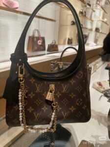 The On My Side MM handbag is made from calf leather. with a perforated Monogram pattern on the sides. Delicate