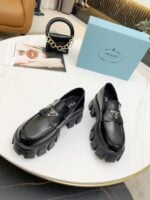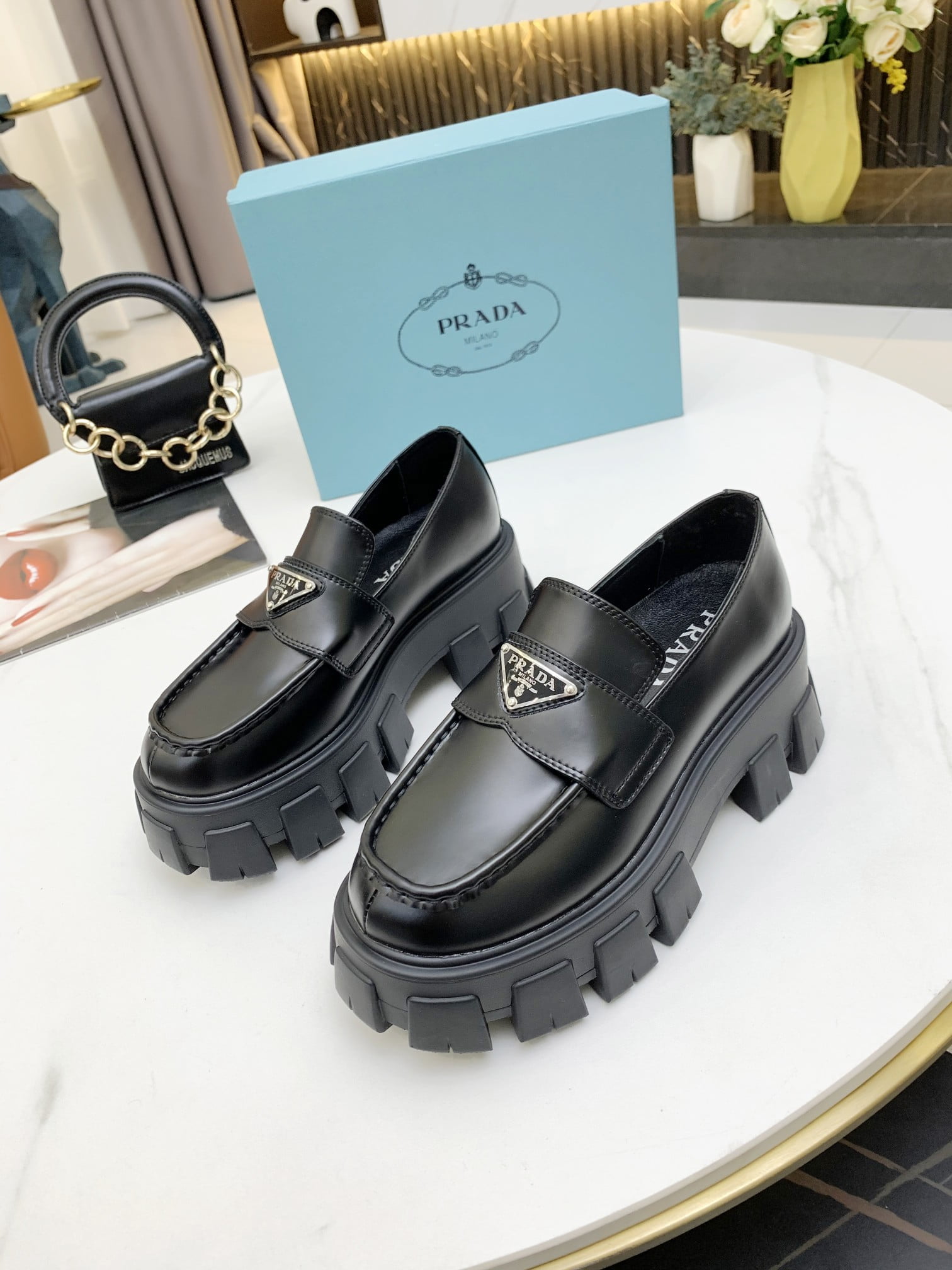 PRADA Spring/Summer 2021 upgraded triangle standard loafer slippers compared to last year’s old loafer shoes, this triangle standard has been changed to silver along the position to increase the gear print design to feel more elegant and fashionable! Thick bottom design on the foot can increase a lot of oh!
