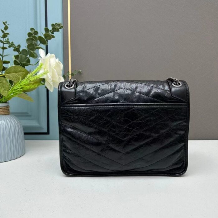 LAURENT front clamshell bag with real leather-covered YSL trim, chain and leather multi-purpose shoulder strap, center compartment and open back pocket. Size 28CM imported leather dual-purpose chain shoulder strap 1 center compartment, 1 inner bag, 1 zipper pocket, 1 open progen, 1 flip bottom pocket